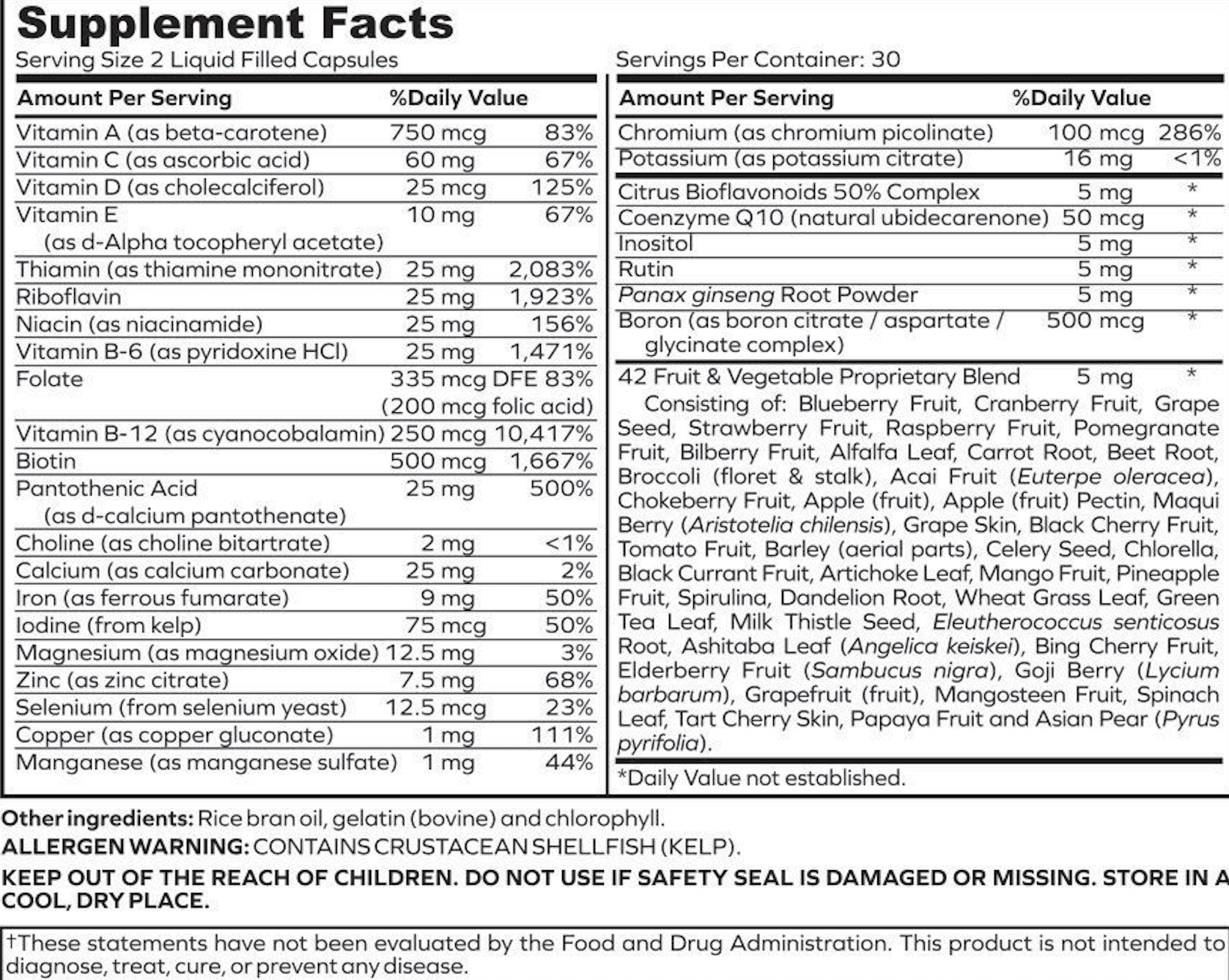Our Ultimate multivitamin contains a 42 Fruit and Vegetable blend that expertly provides the body with everything it needs to run at its highest level.†